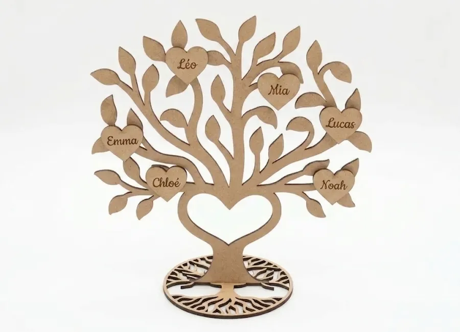 Phil grave d’abord les motifs au laser sur le MDF (un panneau de bois lisse et résistant), puis découpe les branches, le tronc et les cœurs avec précision. Chacun des 6 cœurs peut porter un prénom — les vôtres, ceux de vos enfants, d’une famille entière.