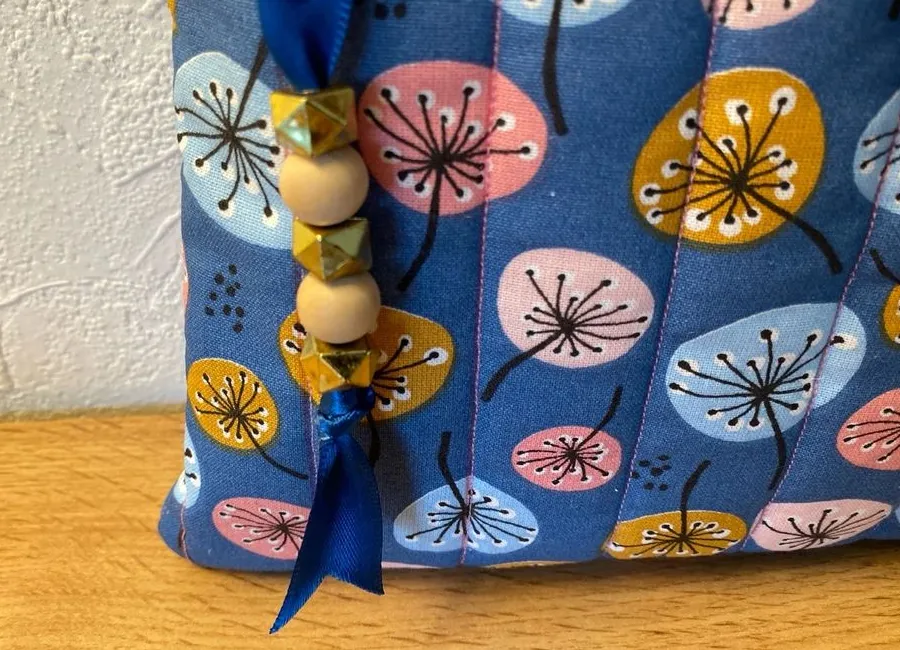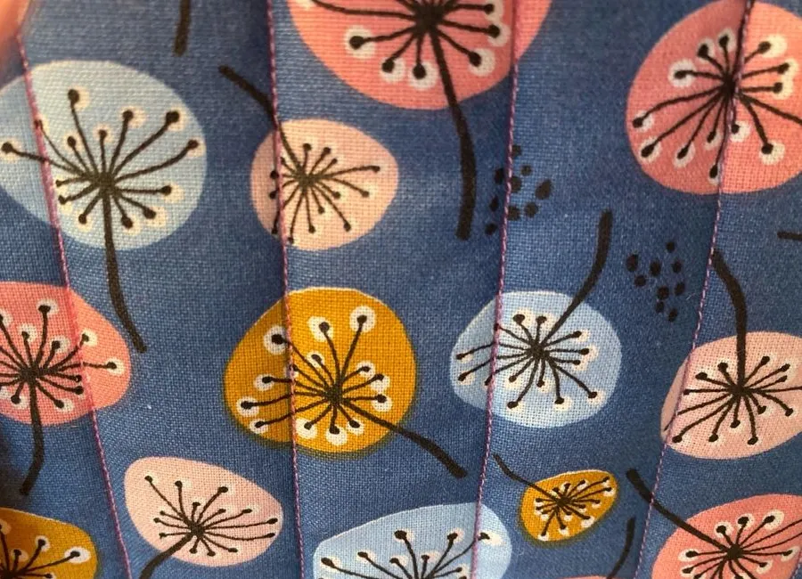 • Matériau : tissu fleuri fond bleu marine, doublure rose, ouatine matelassée