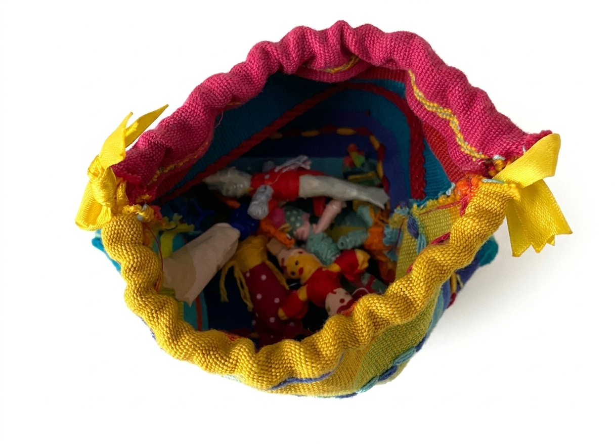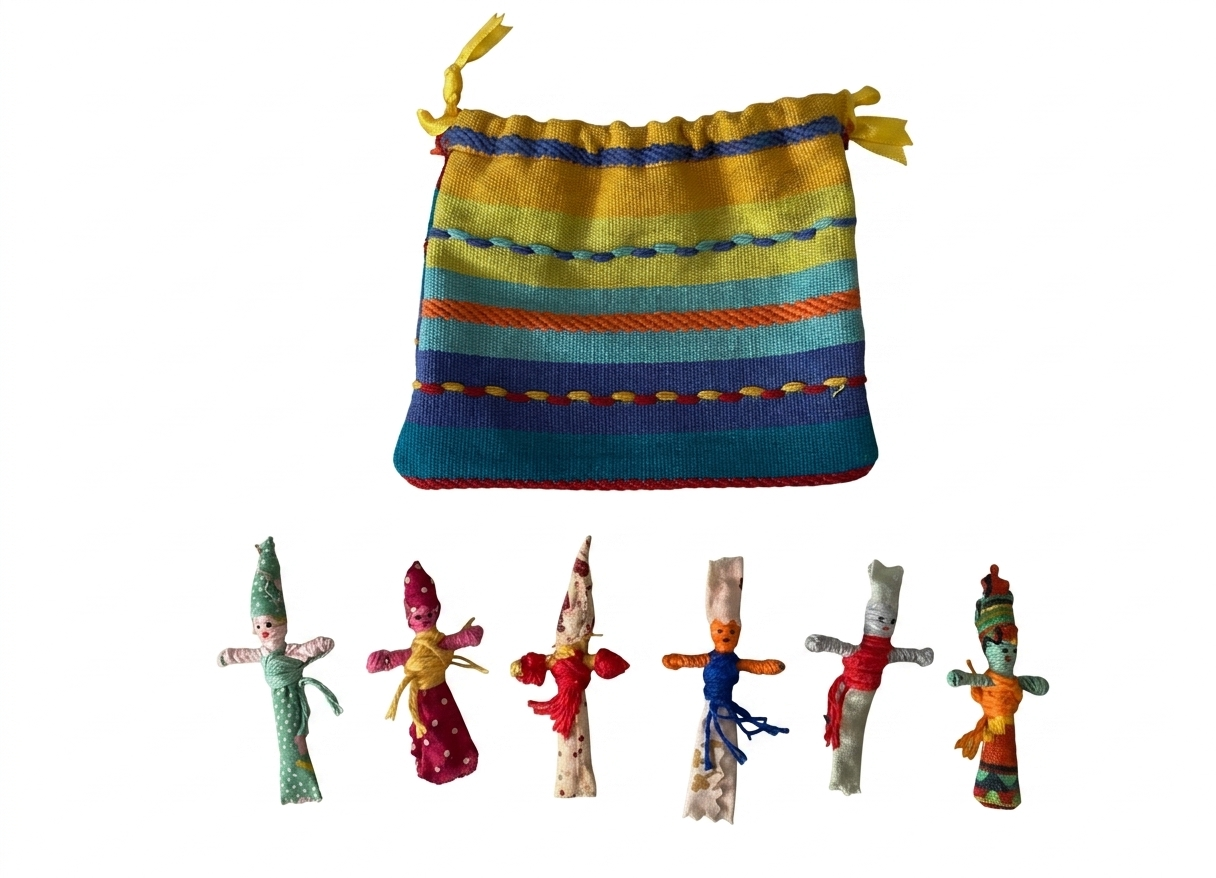 La légende dit que si tu confies tes tracas à ces six poupées mange-soucis tissu cousu main avant de dormir, elles s’en chargent pour toi. Flo coud chaque poupée à la main dans des tissus colorés et joyeux, puis les range dans une pochette rayée beige fermée par un ruban — prête à glisser sous l’oreiller ou dans le sac d’école.