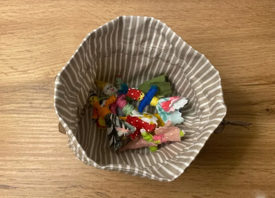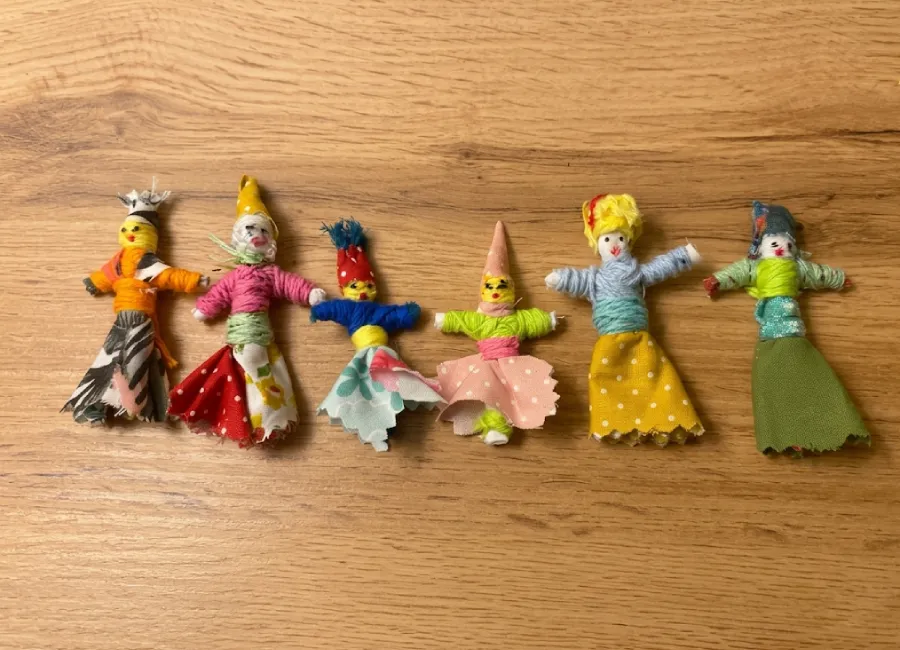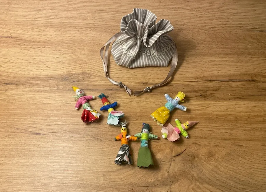 La légende dit que si tu confies tes tracas à ces six petites poupées avant de dormir, elles s’en chargent pour toi. Flo coud chaque poupée à la main dans des tissus colorés et joyeux — puis les range dans une pochette en tissu rayé fermée par un ruban, prête à glisser sous l’oreiller ou dans le sac d’école.