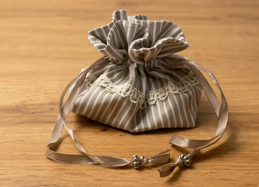🧵 Matériau : coton coloré cousu main, pochette tissu rayé avec ruban